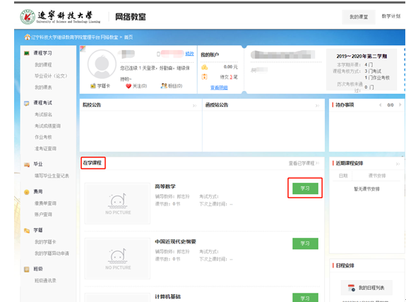 1、登錄后,進(jìn)入主頁(yè)面,找到在學(xué)課程,然后進(jìn)入學(xué)習(xí)。