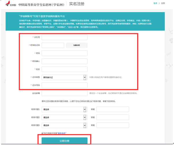 注冊頁面:只需填寫紅框里的內(nèi)容,必須用學(xué)生本人手機(jī)號。