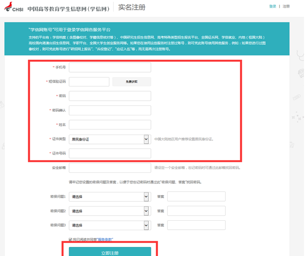 注冊(cè)頁面:只需填寫紅框里的內(nèi)容,建議用學(xué)生本人手機(jī)號(hào)。