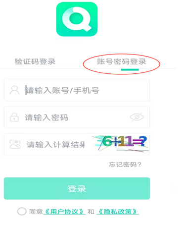 2、選擇賬號(hào)密碼登錄(注意第一次登陸必須用賬號(hào)密碼登錄,登錄后綁定手機(jī)號(hào),綁 定手機(jī)號(hào)之后可以選擇驗(yàn)證碼登錄)