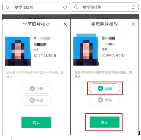、如無誤,請在學(xué)歷照片處點(diǎn)擊確認(rèn),然后告知自己的班主任,已完成圖像校對。如有誤,請第一時間聯(lián)系自己的班主任。